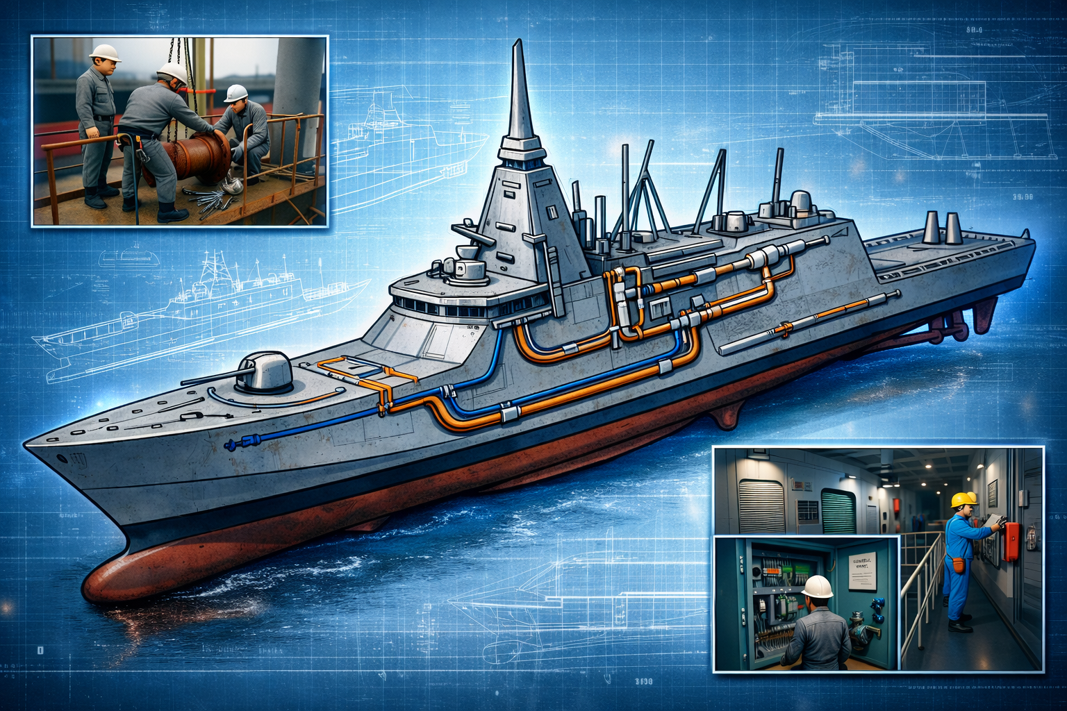 当社は、海上自衛隊の護衛艦をはじめとする艦艇や、コンテナ船などの各種商船の建造プロジェクトにおいて、電気工事および配管工事を請け負っています。 主に、三菱重工業株式会社様、今治造船株式會社様、株式会社大島造船所様の各造船所にて、新造船・修繕船の工事に対応しており、豊富な実績と技術力に基づいた高品質な施工を強みとしています。 また、当社は一般社団法人日本船舶電装協会の正会員企業として、業界基準に準じた施工品質と安全管理体制を確立し、船舶電装工事のプロフェッショナルとして信頼をいただいております。