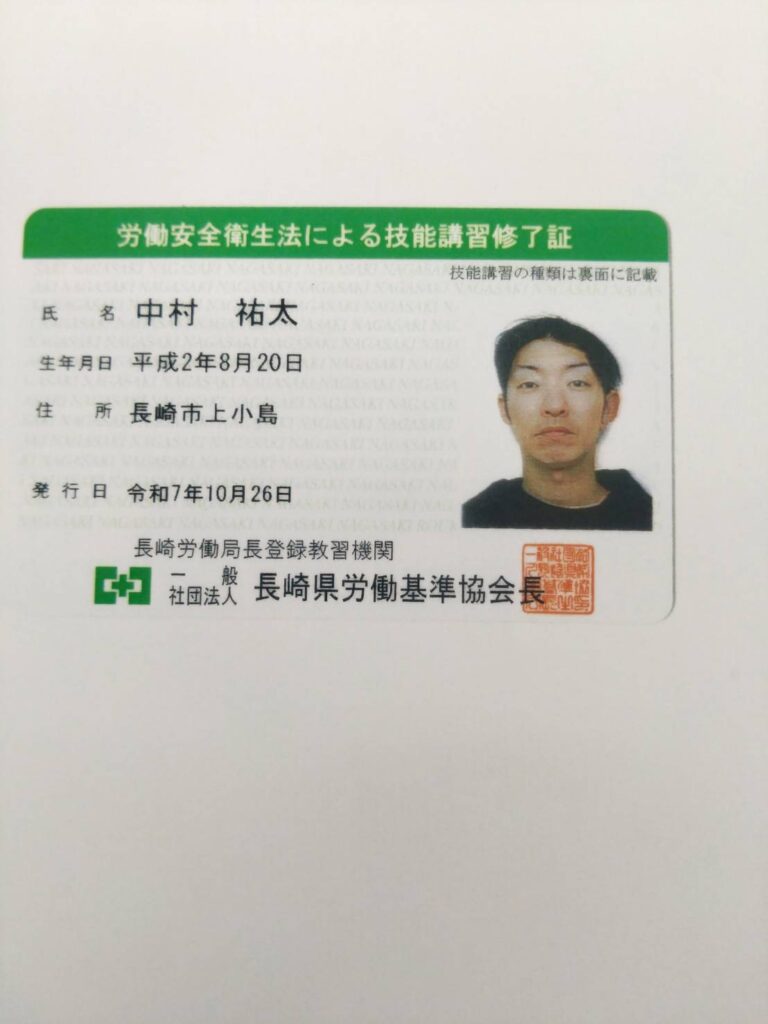 この度、弊社社員が玉掛け技能講習の資格試験に合格して免許を取得しました