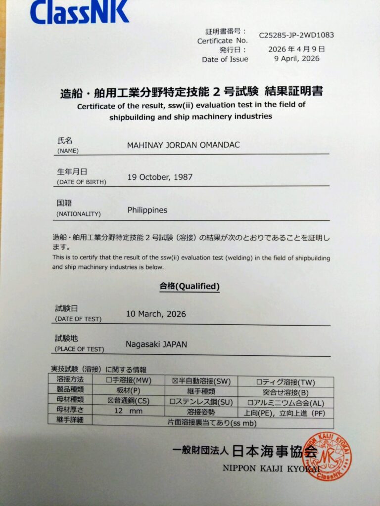 この度、特定技能2号試験にダノック、フランシスの2名が合格しました。